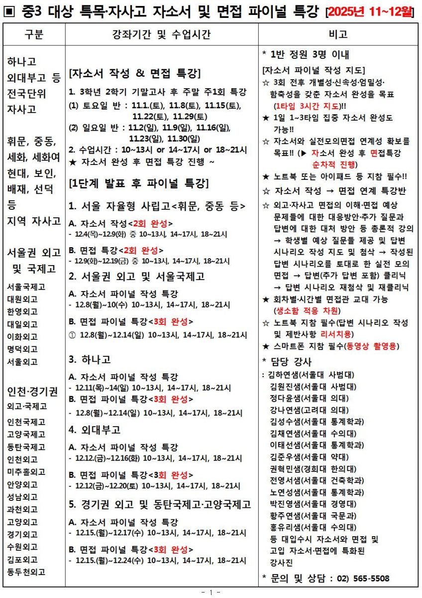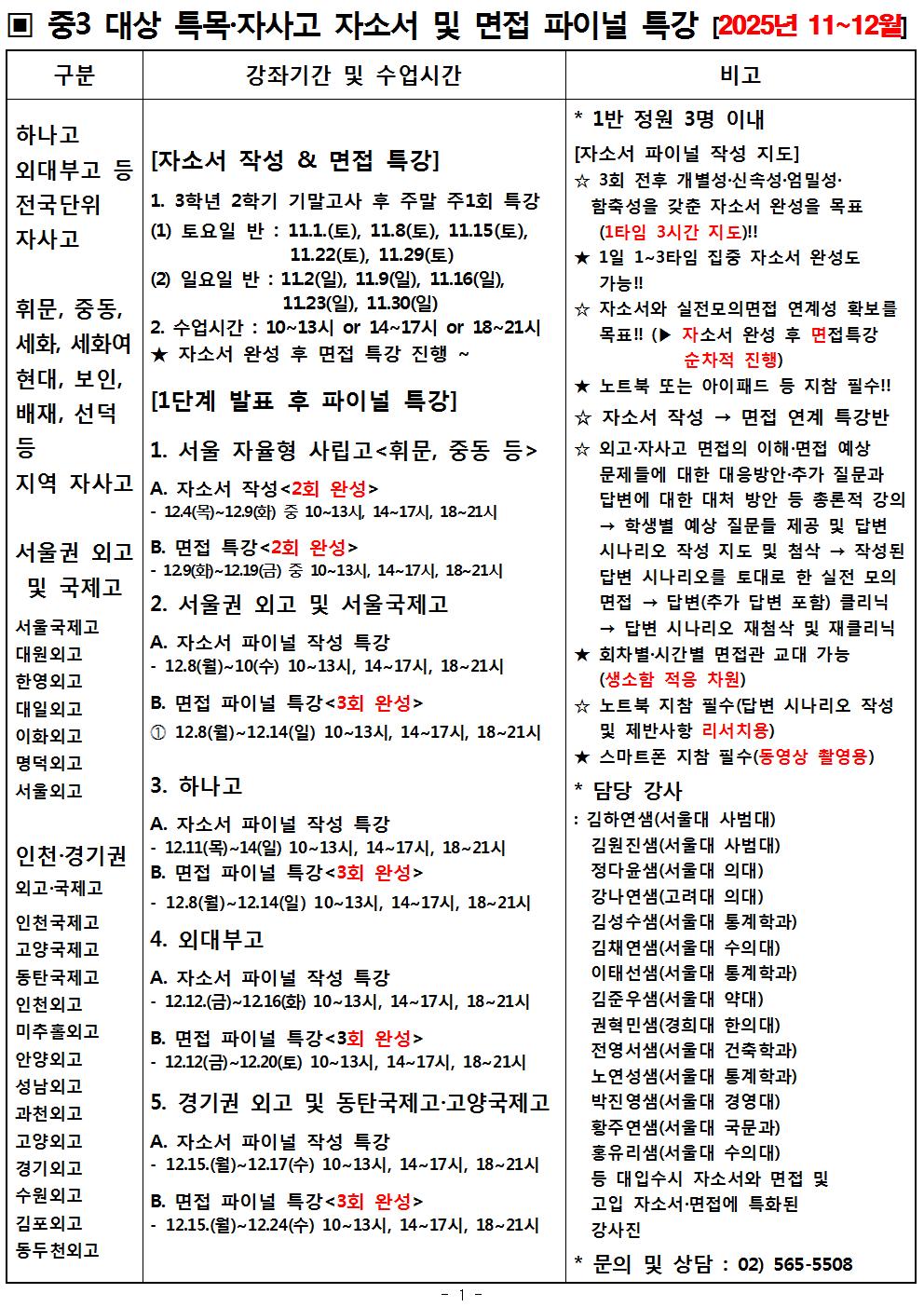 ★ 2025년 11~12월 외고·자사고<하나고·외대부고 등>·국제고 자소서 및 면접 특강